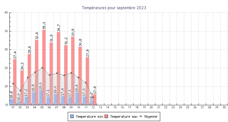 | 09 | 17.1 °C à 07:10 | 33.5 °C à 13:27 | 23.7 °C | 2.2 km/h (15.6 km/h) | 12 |