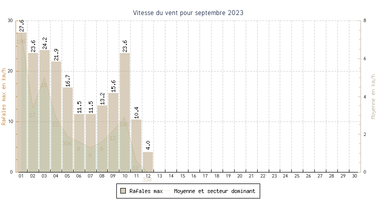 | 01 | 16.6 °C à 23:54 | 27.4 °C à 14:24 | 20.8 °C | 7.3 km/h (27.6 km/h) | 196 |
